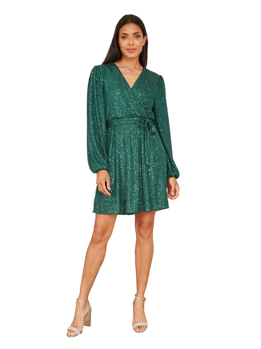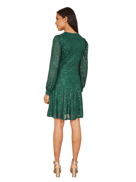 Mela Green Sequin Long Sleeve Frill Wrap Dress