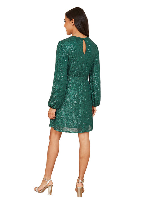 Mela Green Sequin Belted Wrap Long Sleeve Dress