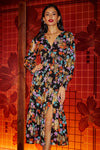 Yumi Black Floral And Foil Ruched Midi Dress With Split Hemline