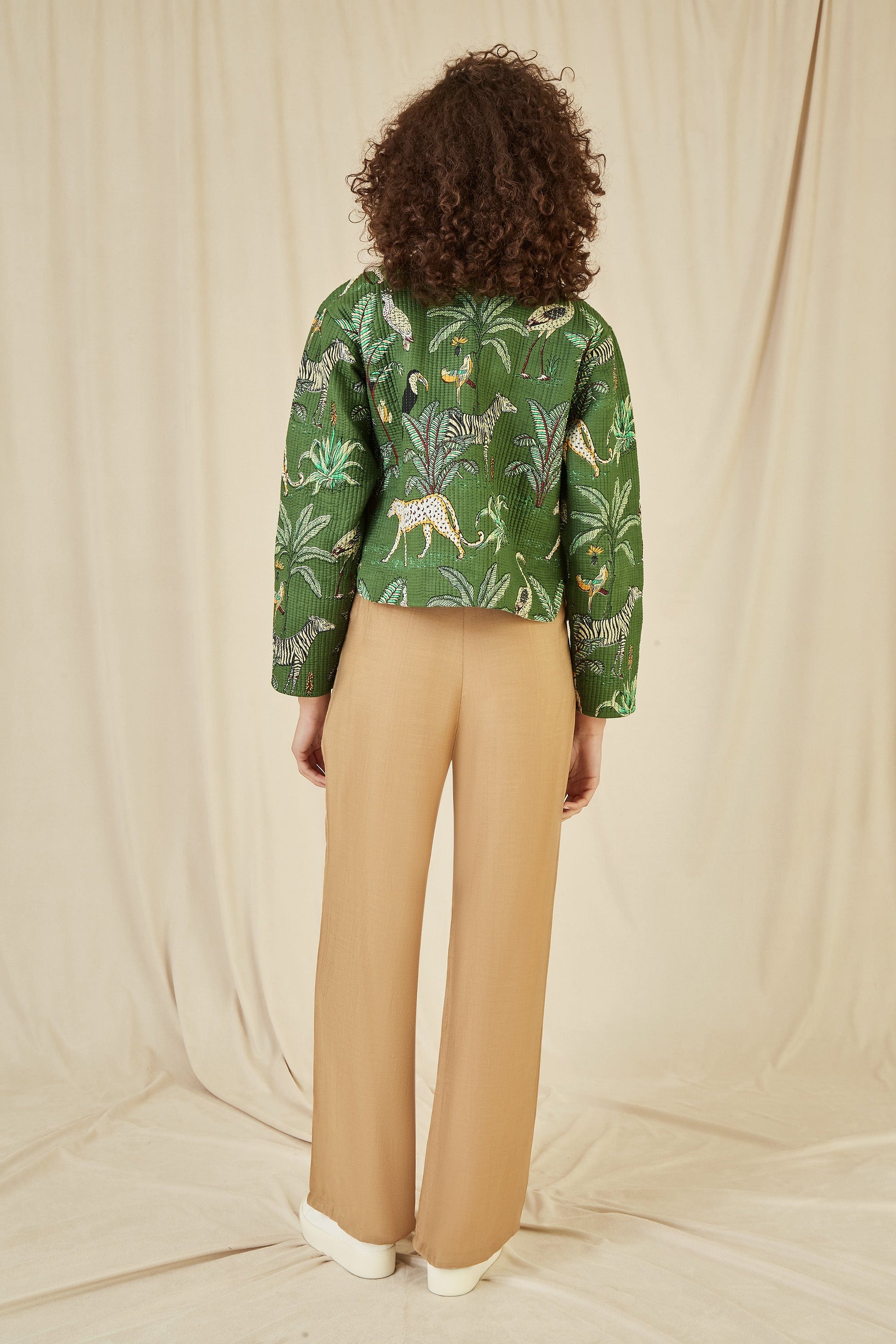Yumi Green Animal Print Reversible Cotton Cropped Quilted Jacket