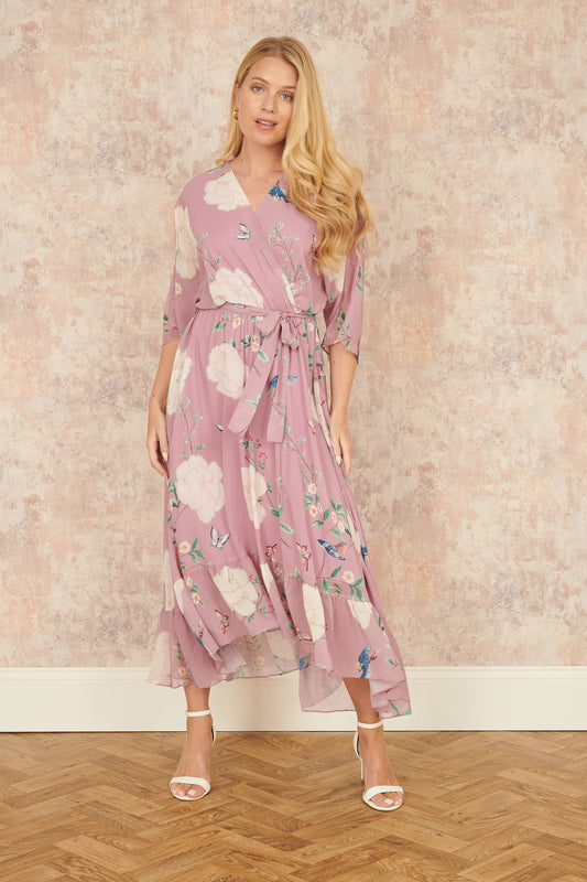 Yumi Pink Bird and Floral Print Midi Wrap Dress