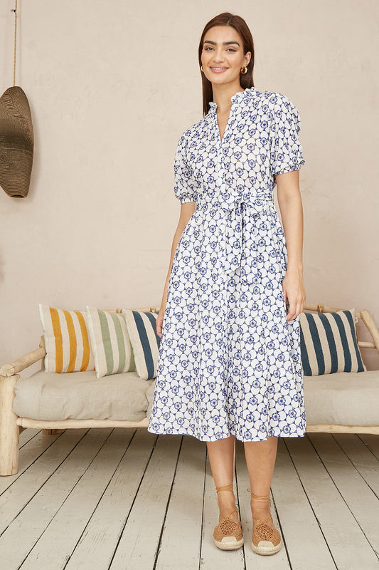 Yumi Viscose Blue Ikat Print 3/4 Sleeve Tunic Dress