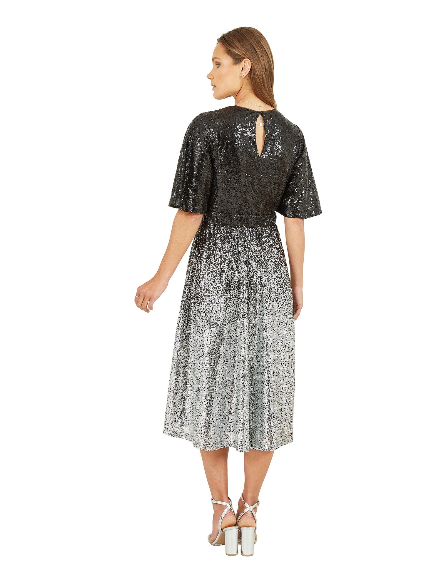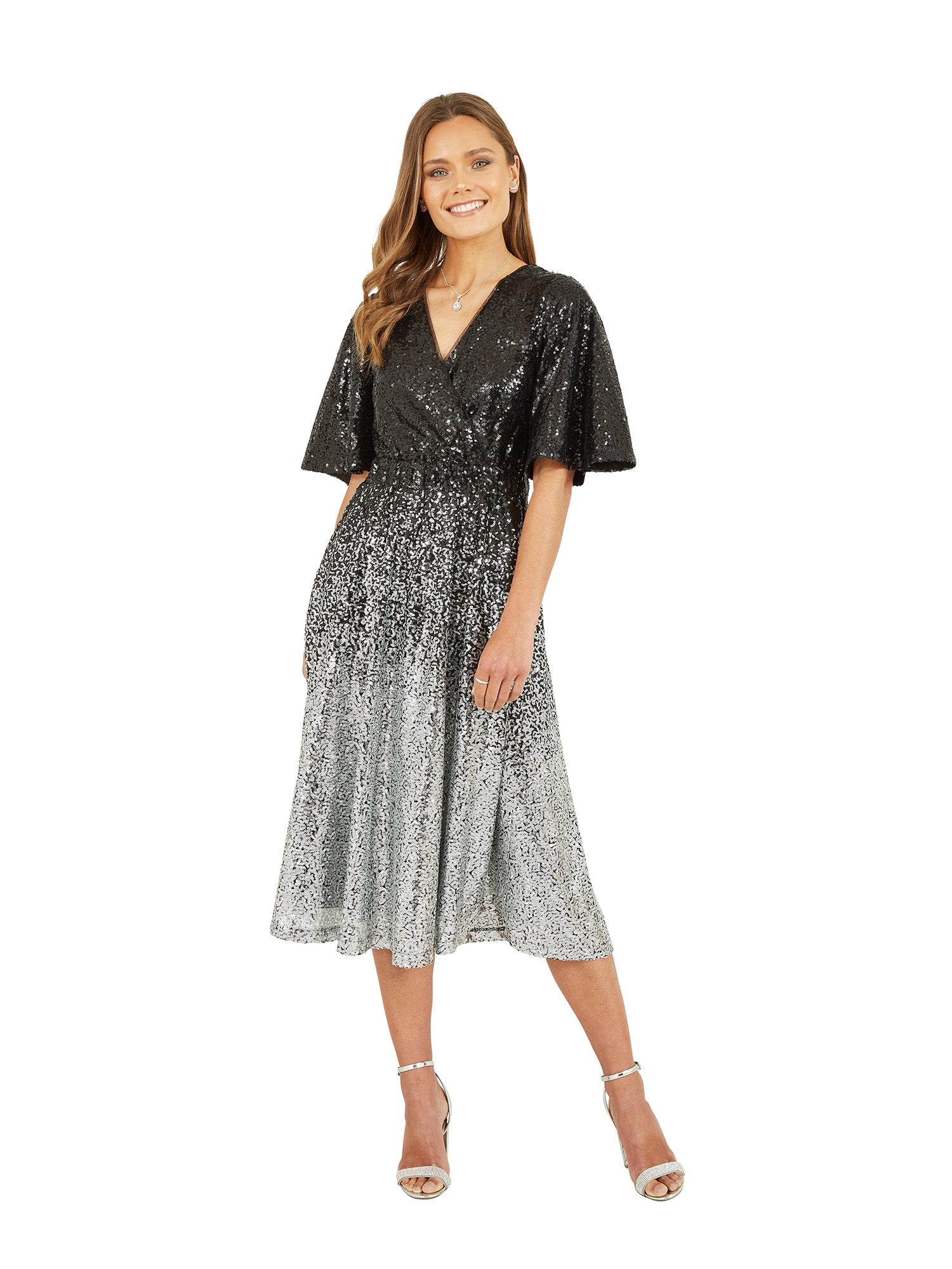 Yumi Black And Silver Ombre Sequin Midi Wrap Dress