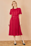 Yumi Red Satin Striped Midi Dress With Pleats and Matching Belt
