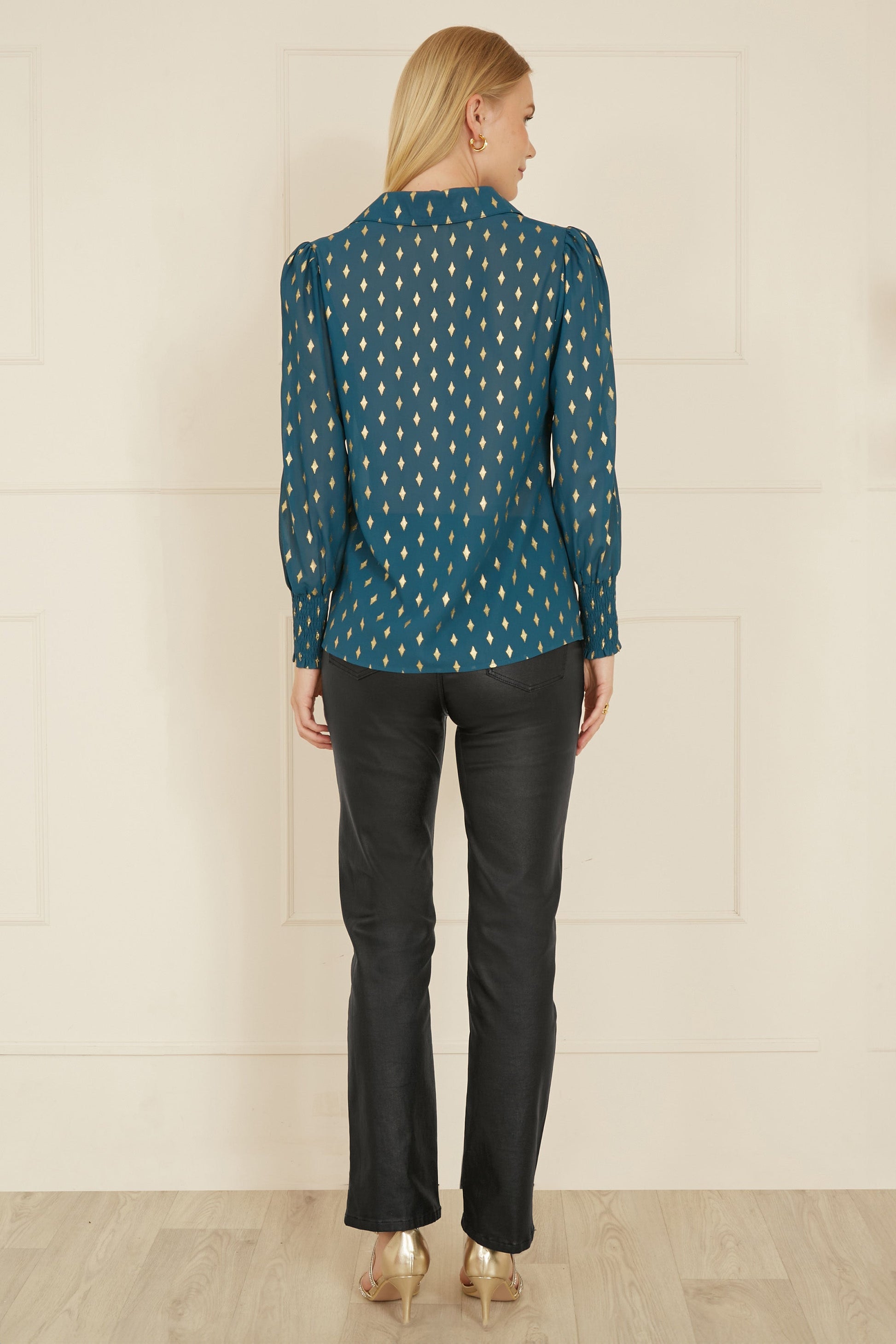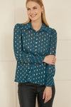 Yumi Teal Diamond Foil Print Top With Ruched Cuff