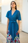 Yumi Teal Mesh Wrap Midi Dress With Floral Hem Border
