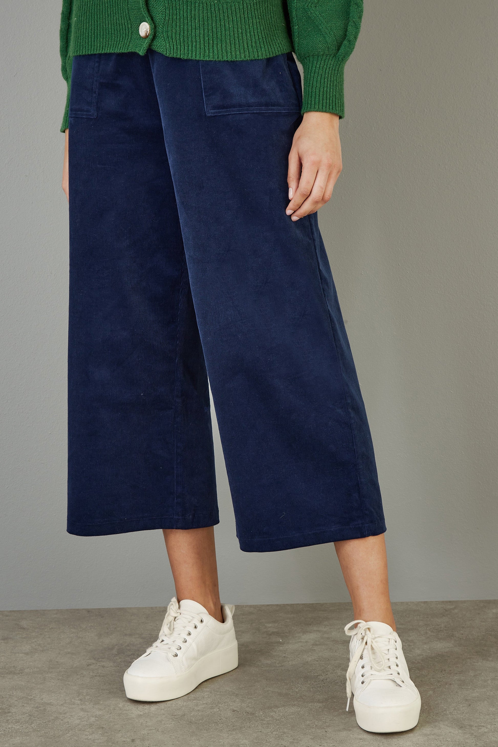 Yumi Navy Cord Cropped Wide Leg Trousers With Pockets